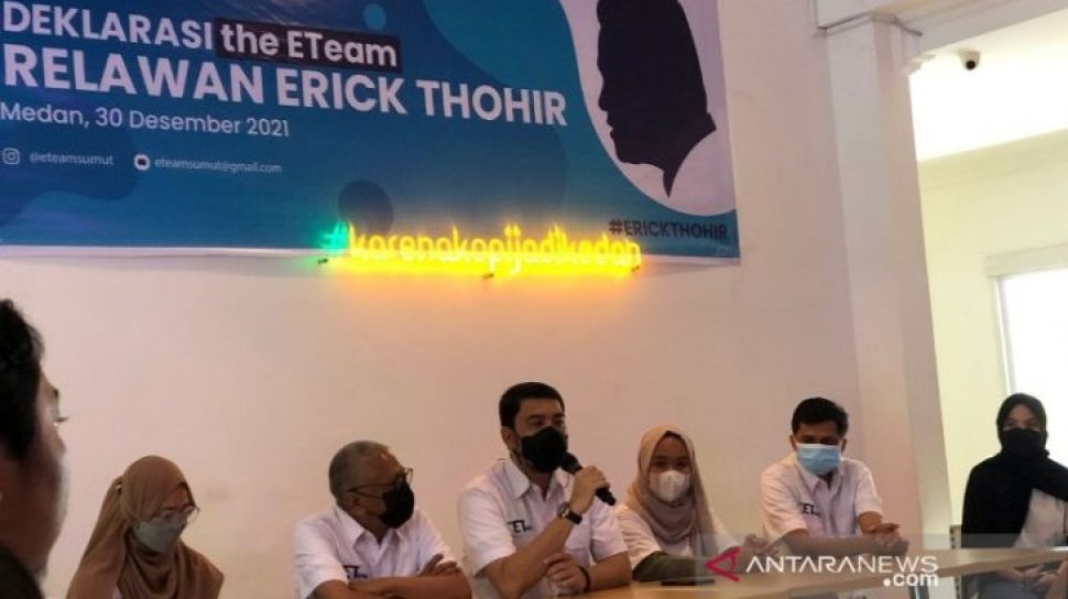 SuaraSumut.id - Sekelompok orang menamakan diri relawan ETeam mendeklarasikan dukungan agar Menteri BUMN Erick Thohir menjadi capres 2024.