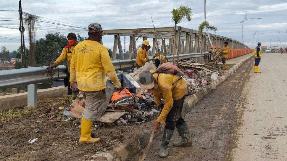 Petugas dari Kementerian Pekerja Umum (PU) Direktorat Jenderal Bina Marga berjibaku membersihkan jalan yang terdampak banjir, akhirnya berhasil memfungsikan kembali jalur jalan nasional Aceh Tamiang.