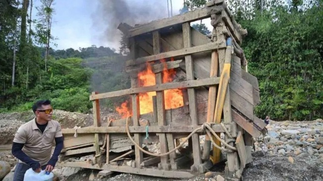 - Aparat membakar peralatan tambang yang ditinggalkan penambang untuk mencegah aktivitas ilegal berulang di lokasi penambangan tersebut.