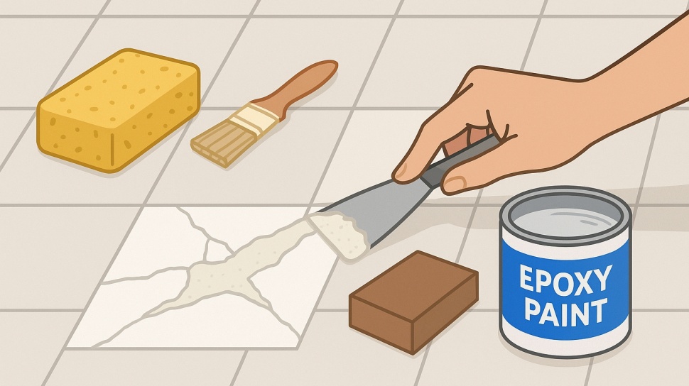 Untuk retakan tipis, cat akrilik berbahan dasar air bisa diaplikasikan untuk menutupi kerusakan dan membuat permukaan halus. Untuk retakan yang lebih dalam atau pecahan, isi dengan cat epoksi, ratakan dengan amplas setelah kering, kemudian cat ulang agar permukaan seragam dan kuat.