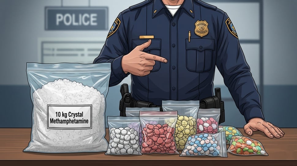 Dalam pengungkapan tersebut, polisi menyita 10 kilogram sabu, 24.000 butir ekstasi, dan 150 butir pil H5 dari tangan dua kurir muda berusia 19 tahun.