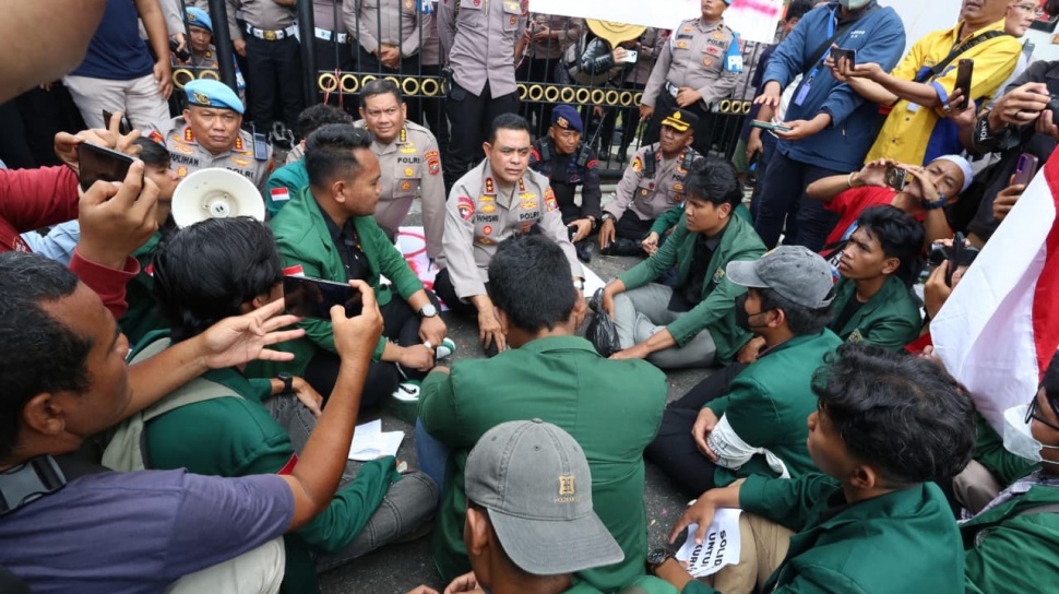 Tak lama kemudian, Kapolda Sumut Irjen Whisnu Hermawan Februanto menemui massa aksi. Ia pun menyuruh massa untuk duduk di tanah.