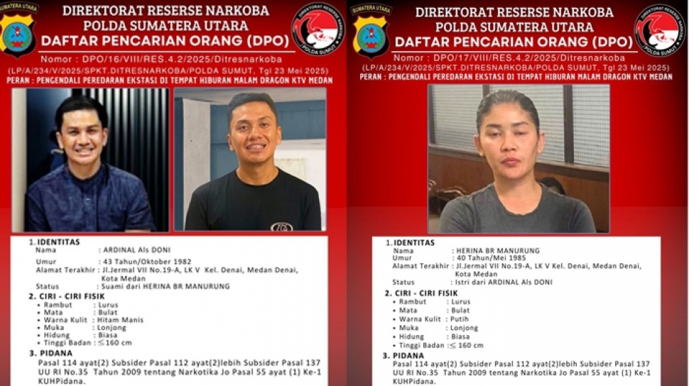 "Berdasarkan hasil penyelidikan dan keterangan para tersangka yang sudah diamankan, kami menetapkan Ardinal alias Doni dan Herina Manurung sebagai DPO. Keduanya berperan sebagai pengendali peredaran ekstasi di Dragon KTV," katanya.