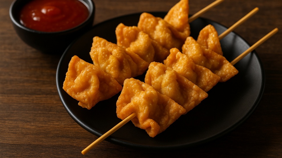 Perpaduan gurih Indomie dengan renyahnya kulit pangsit ini bikin nagih. Cita rasanya mirip mie goreng versi kriuk yang bisa dimakan pakai stick es krim seperti camilan modern.
